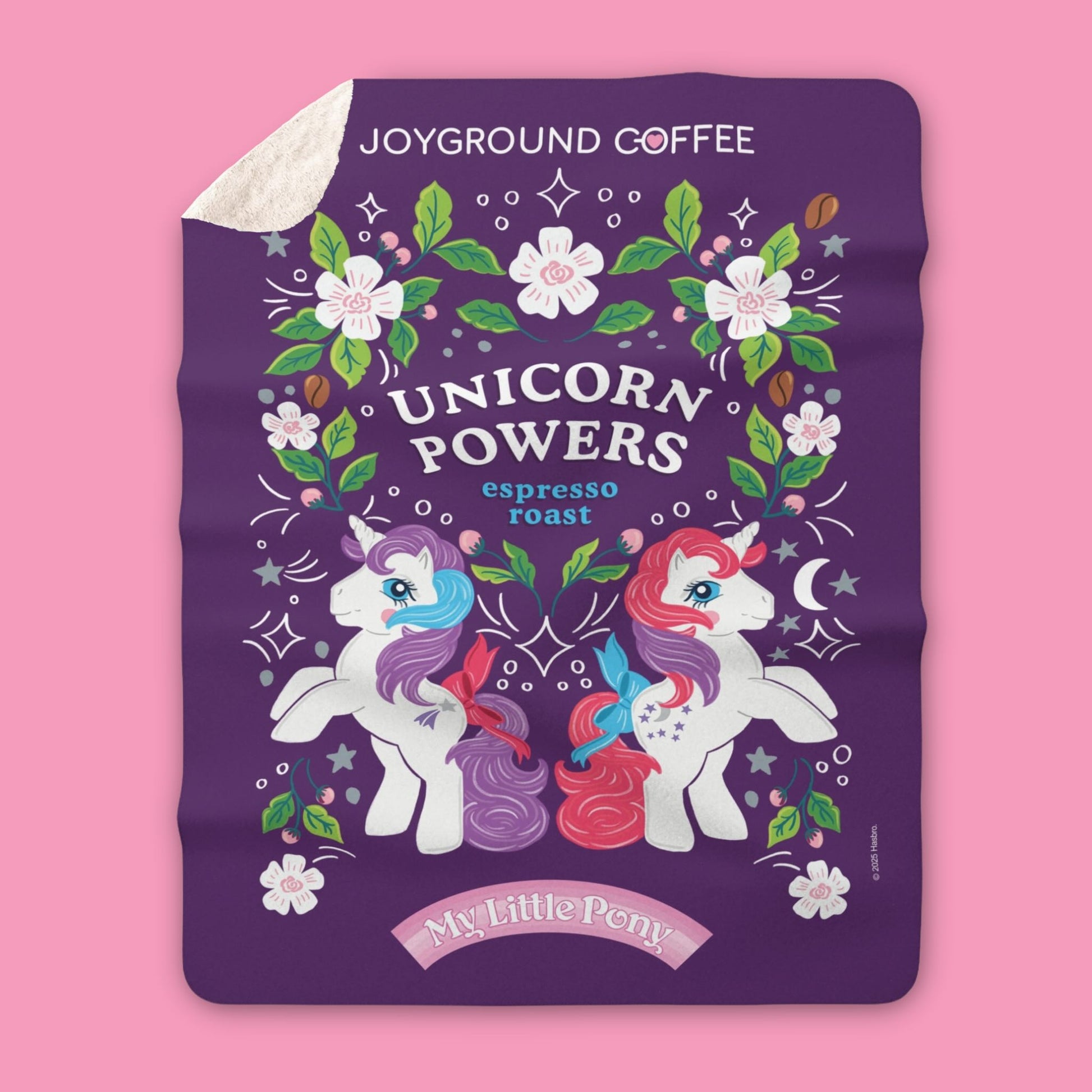 Wrap yourself in a some unicorn magic with our limited edition Unicorn Powers blanket, an oversized sherpa fleece throw from the Joyground Coffee x My Little Pony collaboration. Inspired by our Unicorn Powers Espresso Roast blend, this blanket features both Glory and Moondancer from the vibrant, exclusive illustration on the coffee bag.