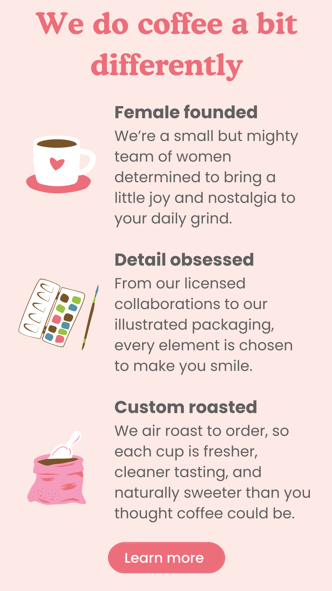 Wake up to a world of color and nostalgia with the officially licensed My Little Pony collection, created in partnership with Hasbro. Our premium coffees and mugs feature hand-illustrated original character art reimagined with an exclusive Joyground Coffee twist. They're whimsical, collectible, and here only for a limited time. Get them before they gallop away!